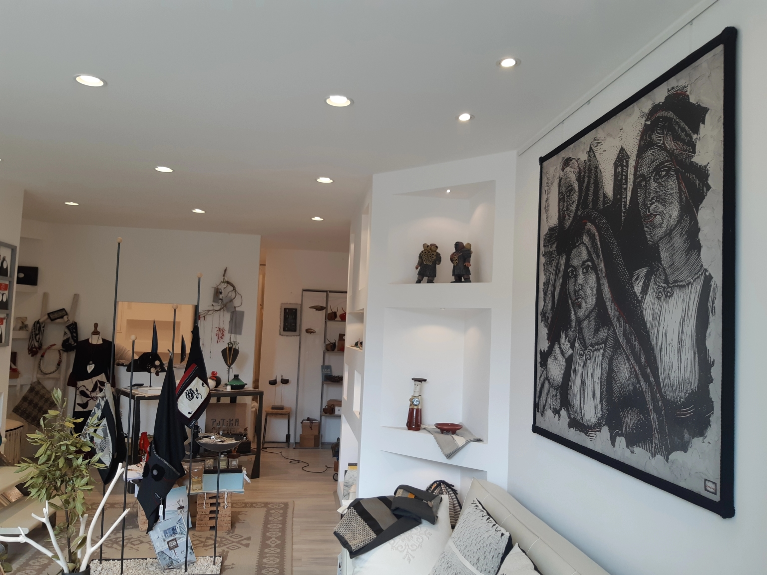 Le pareti bianche accolgono arazzi e tappeti, le nicchie racchiudono i manufatti in ceramica e nell’aria si respira il profumo dell’elicriso ma soprattutto ci sono le storie che nascono da sapienze antiche e si trasformano in oggetti, complementi d’arredo, capi d’abbigliamento che mutano in proposte innovative e contemporanee.